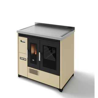 Teplovzdušné kachle na pelety Biscotto s integrovanou nerezovou rúrou 120–240 °C a bočnou zásuvkou na palivo. Nútené vetranie, SELECT kanálovanie, 5 výkonov, ľahká údržba.
