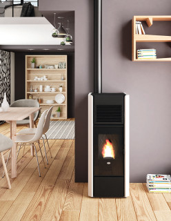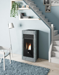 Peletové kachle Giotto ponúkajú elegantný vzhľad s kamenným obkladom a čiernym sklom. Vďaka kompaktnému prevedeniu a nútenej ventilácii poskytujú efektívne a pohodlné kúrenie.