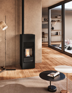 Peletové kachle Giotto ponúkajú elegantný vzhľad s kamenným obkladom a čiernym sklom. Vďaka kompaktnému prevedeniu a nútenej ventilácii poskytujú efektívne a pohodlné kúrenie.